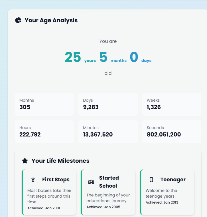 Precise Age Breakdown: Real-time age calculation from years to seconds.