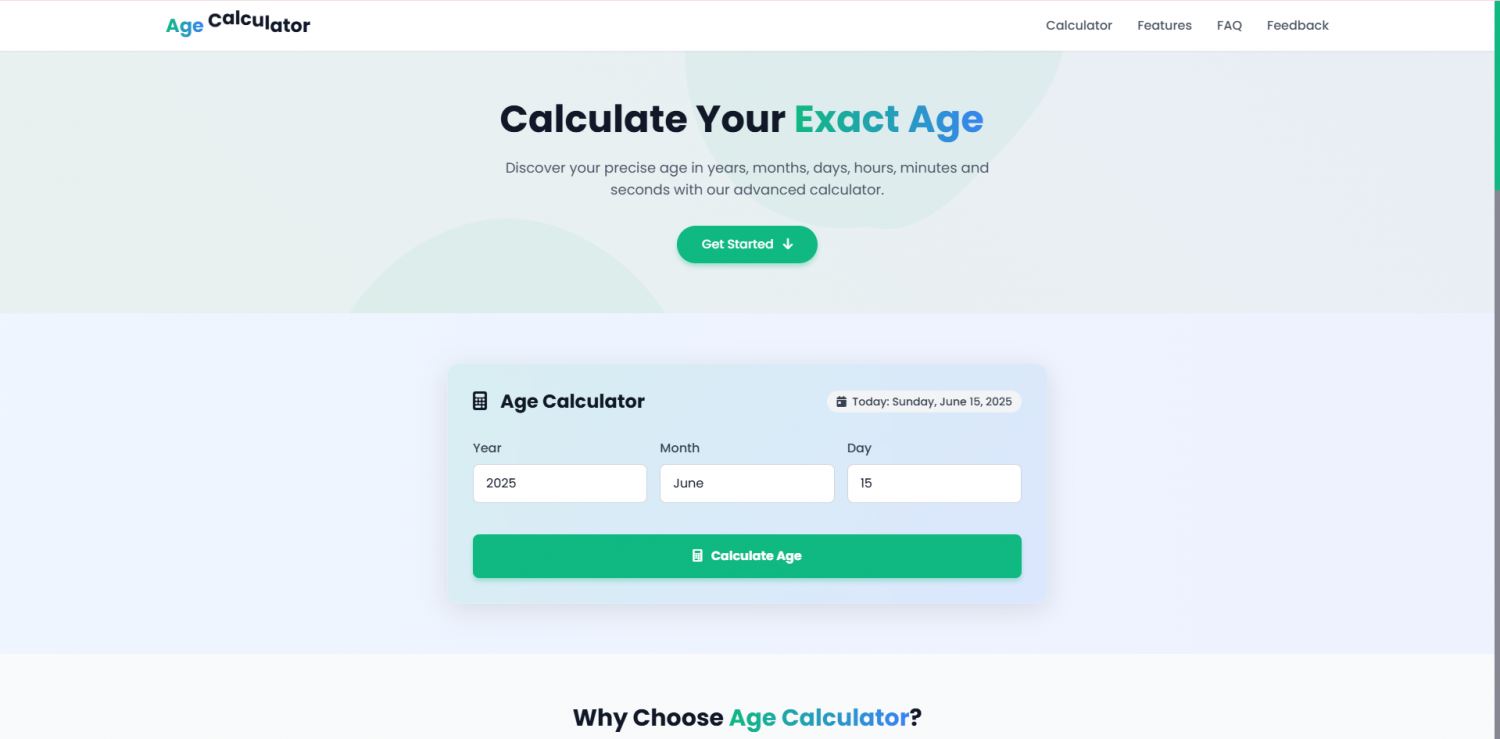 Hook your audience instantly. The Modern Age Calculator is a sleek, interactive age calculator website source code that calculates your exact age in years, months, days, hours, minutes, and seconds—a truly captivating HTML CSS JavaScript age calculator experience. With a live life tracker, birthday countdown, and fun age facts, this tool is mobile-responsive, lightning-fast, and built with stunning glassmorphism UI using Tailwind CSS.